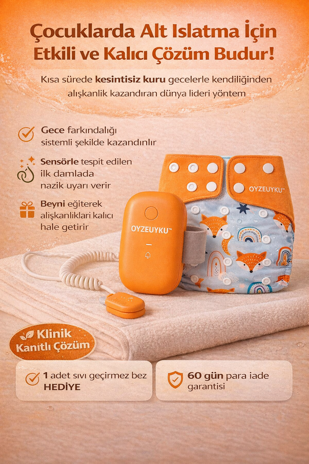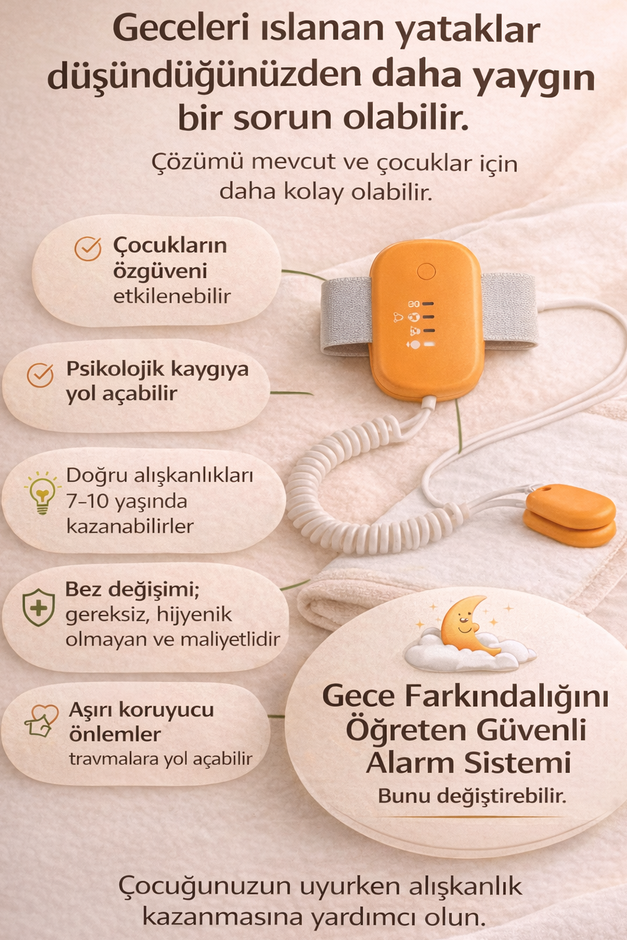 Gece alt ıslatma sorununu algılayarak alarm verir, çocuğunuzun tuvalete yönelmesine yardımcı olur. Düzenli kullanımda kalıcı bir alışkanlık kazandırır.